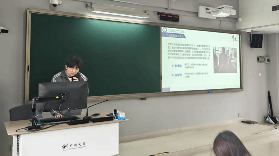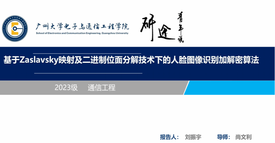 刘振宇同学介绍的主题是基于二进制位面分解技术及Zaslavsky映射下的人脸图像加解密算法。本次内容针对图像加密领域,结合民航机场安检过程中人脸图像数据的安全性进行加密解密算法的设计,随着图像数据广泛应用,隐私泄露风险加剧,传统加密算法难以兼顾实时性与安全性,民航人脸图像安全尤为关键。本文聚焦该问题,主要开展两项研究:一是针对传统算法不足,基于二维Zaslavsky映射设计伪随机对称加密算法,通过位平面分解、“预处理 - 扩散 - 混淆” 流程及多重混淆策略,经安全性能分析验证其高安全性;二是面向民航场景,基于IMDB-WIKI数据集,采用Haar级联分类器实现人脸捕获,结合上述加密算法构建 “捕获 - 加密 - 解密” 全流程方案。研究证实混沌映射技术的应用价值,方案兼顾安全与时效,为民航人脸数据安全提供有效解决方案,具参考意义。