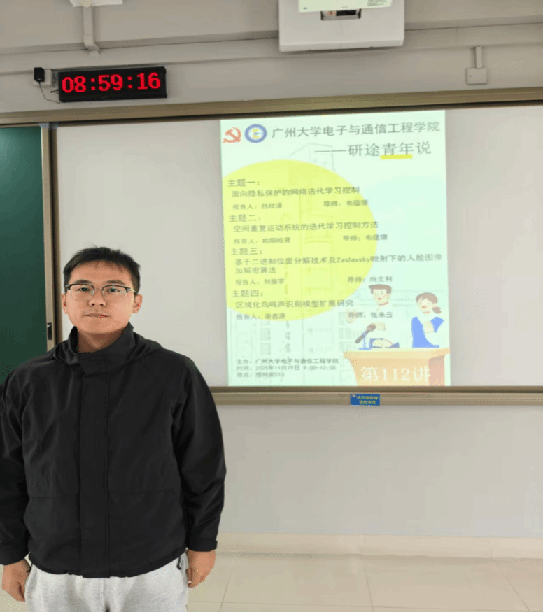 主办的“研途青年说”第112讲于11月19日9:00-10:00在理科南513举行。本次主讲人为23级研究生吕欣泽、欧阳皓贤、刘振宇和谢鑫源。