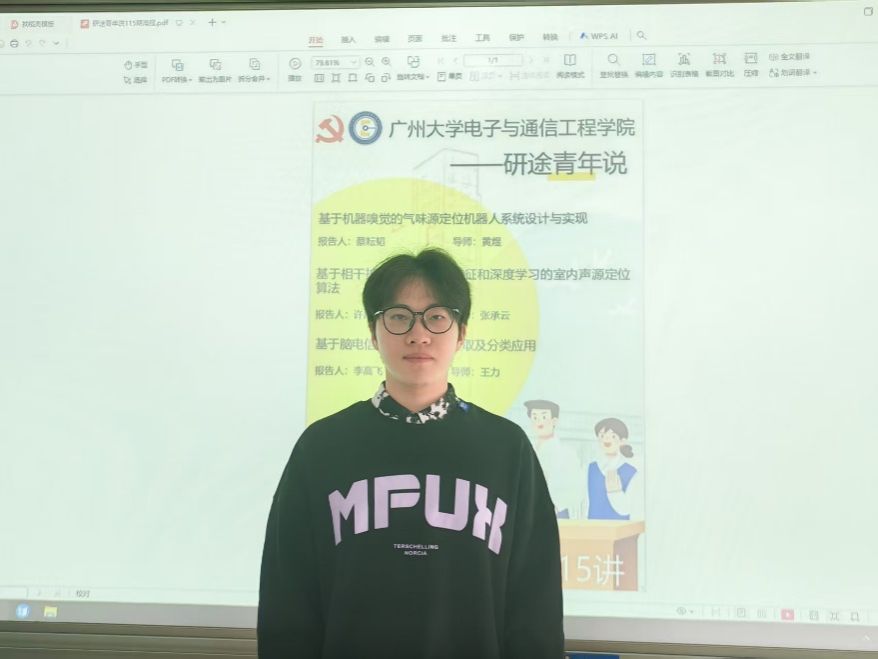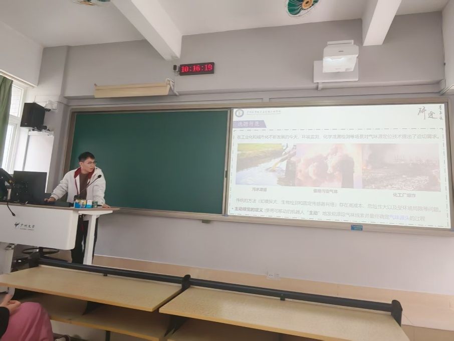 蔡耘韬同学汇报的主题是基于机器嗅觉的气味源定位机器人系统设计与实现,他的讲解主要包含以下6个部分:选题背景及意义、现状与研究目标、研究方法及过程、关键技术与实践难点、研究结果与应用、论文总结。汇报围绕环境监测、泄漏检测等场景的气味源定位需求展开,针对传统方法高成本、危险性大、受环境局限的问题,探索机器人主动嗅觉技术。研究搭建了含 MQ-3 乙醇传感器的机器人平台,采用螺旋式扩展搜索、浓度梯度追踪策略,结合改进算法优化定位效果。通过两轮实验验证,系统可精准定位气味源,且定位时间随机器人与气味源距离增加呈显著增长趋势。该研究为挥发性化学源快速定位提供了新的技术方案,适用于空气污染监测、泄漏定位等场景,具有实际应用价值。