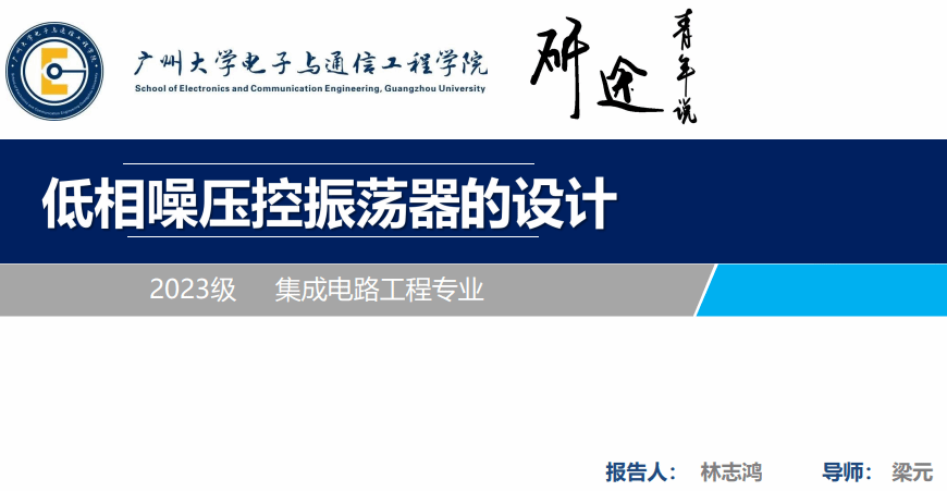 林志鸿同学汇报的主题是低相噪压控震荡器的设计,他的讲解主要包含以下6个部分:选题背景及意义、现状与研究目标、研究方法及过程、关键技术与实践难点、研究结果与应用、论文总结。 围绕低相噪压控振荡器(VCO)设计展开,聚焦 65nm CMOS 工艺双频段低相噪 VCO 研发。阐述通信技术发展对 VCO 的需求及其实践意义,分析国内外研究现状与不足,明确双频段覆盖、低相噪等核心目标。介绍理论分析、仿真设计、实验测试的研究方法,详解低相噪 LC-VCO 优化、倍频器设计、低噪声电源搭建三大关键技术。展示电路性能达标情况及在 6G、毫米波雷达等场景的应用前景,总结课题对相关领域的技术参考价值。
