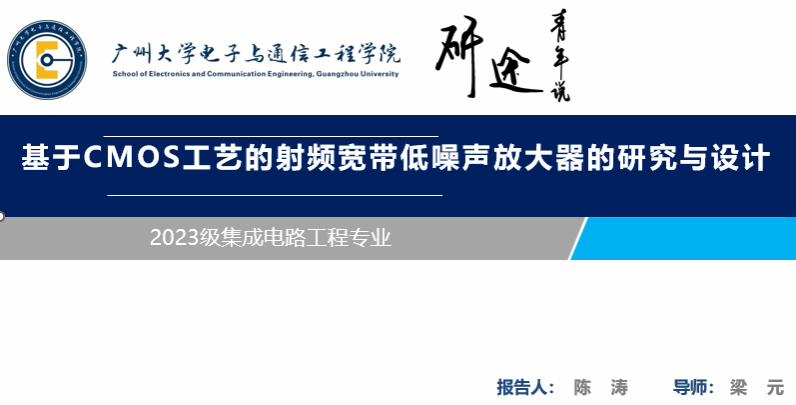 陈涛同学汇报的主题是基于CMOS工艺的射频宽带低噪声放大器的研究,他的讲解主要包含以下6个部分:选题背景及意义、现状与研究目标、研究方法及过程、关键技术与实践难点、研究结果与应用、论文总结。陈涛同学首先简述研究背景近年来,随着硅基工艺器件尺寸等比例缩小,CMOS晶体管的截止频率已增大到数百GHz。上图显示了半导体工艺的发展趋势,其中65nm、40nm和28nmCMOS晶体管的特征频率分别达到了200GHz、250GHz和300GHz,远高于目前K/Ka/Q/V等频段通信系统的工作频率。因此,CMOS工艺不仅能应用于低频设计,也能满足毫米波甚至亚太赫兹应用的基本需求。
