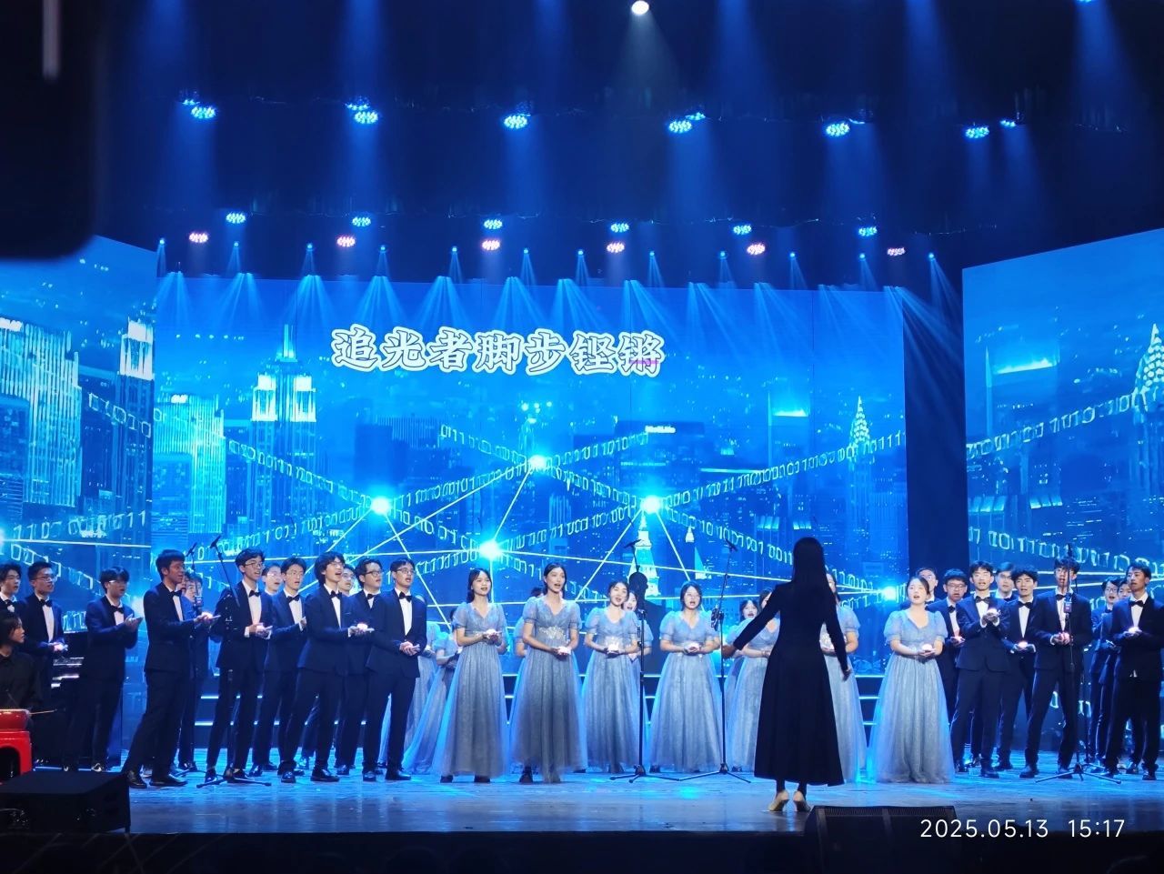 合唱团迎来突破 ——首次晋级决赛,凭借两支风格鲜明的曲目获得佳绩。经典演绎《奉献》摘得优秀奖,AI 原创歌曲《追光者永不停歇》荣获 AI 创作奖二等奖,用歌声传递温暖与力量,以创新点亮艺术之光!为学院书写了青春奋斗的精彩篇章!